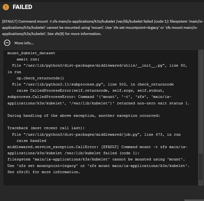 Cause: is that for some weird reason the mountpoint property for /ix-applications/k3s/kubelet was set to something other than legacy. So a command to mount kubelet on /var/lib/kubelet will fail. Could be you changed your ethernet port for example.